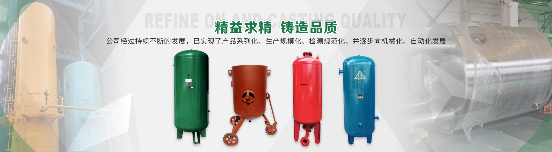 本企業(yè)產(chǎn)品有眾多產(chǎn)品分類(lèi),儲(chǔ)氣罐、磨料桶、碳鋼儲(chǔ)氣罐、不銹鋼儲(chǔ)氣罐、中高壓儲(chǔ)氣罐、臥式儲(chǔ)氣罐、緩沖罐、隔膜罐、噴砂罐、分氣缸、以及其他的定做非標(biāo)產(chǎn)品等,產(chǎn)品廣泛應(yīng)用于化工、制藥、橡膠、石油、食品、機(jī)械等行業(yè)。